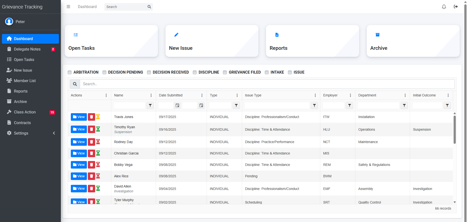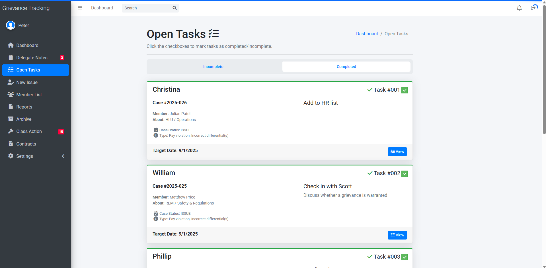 A grievance tracking software application designed for unions to be able to log every step of their filing procedure. Directors can open issues/grievances, access files and utilize workflow tools to keep track of every step in the process, as well as log correspondence, alert union officials of upcoming deadlines, manage tasks, and view case archives. Administrators can easily grant/deny user access to certain cases. Delegates may also log into the system in order to request access to cases by uploading their meeting notes from sit-downs with union members.